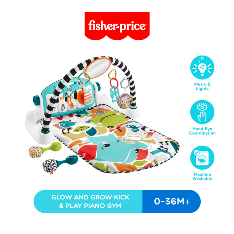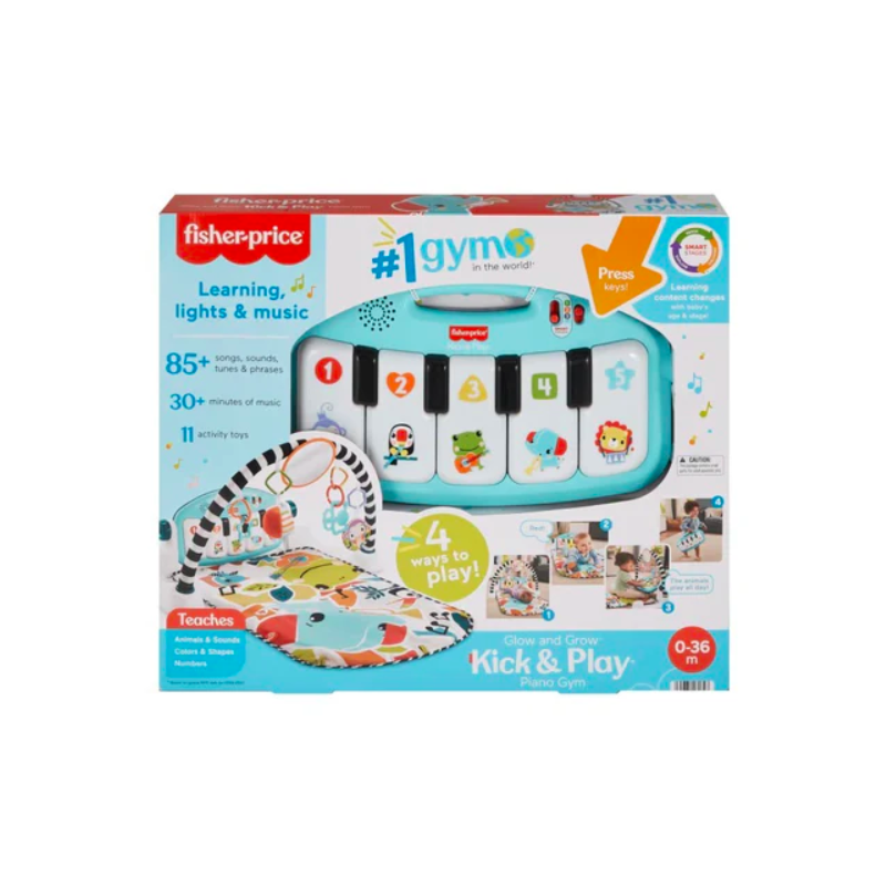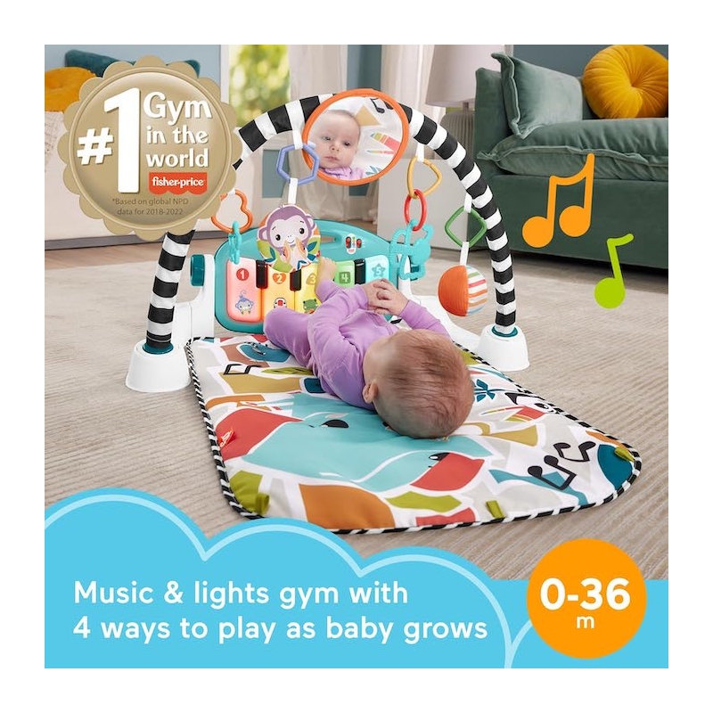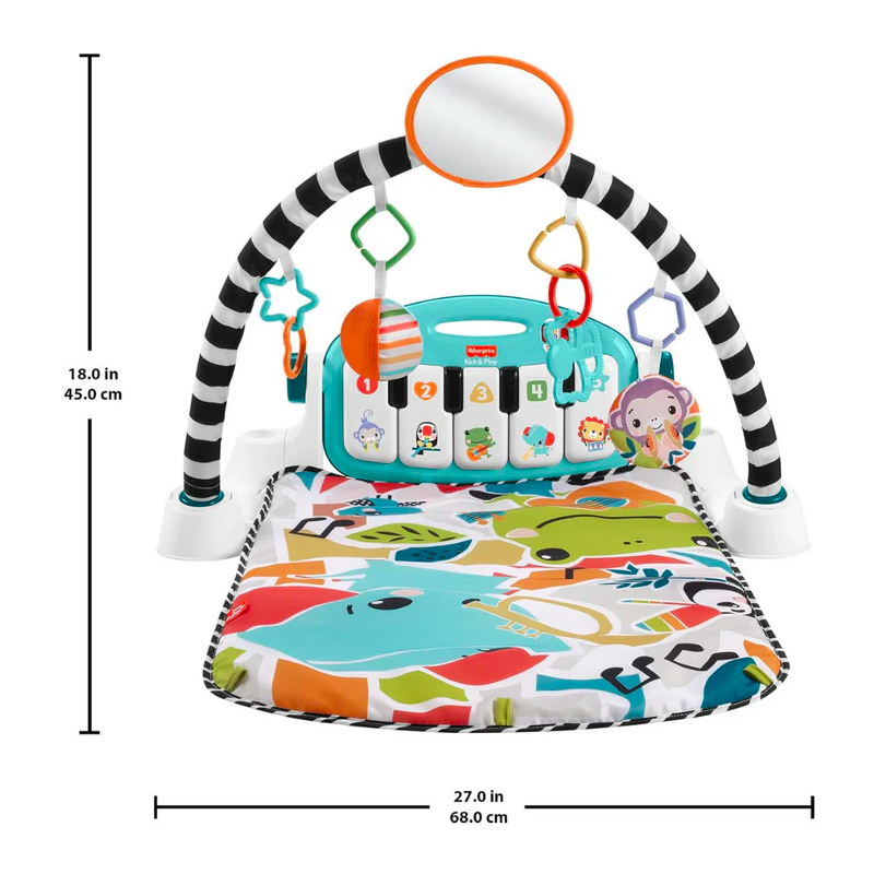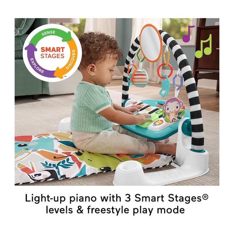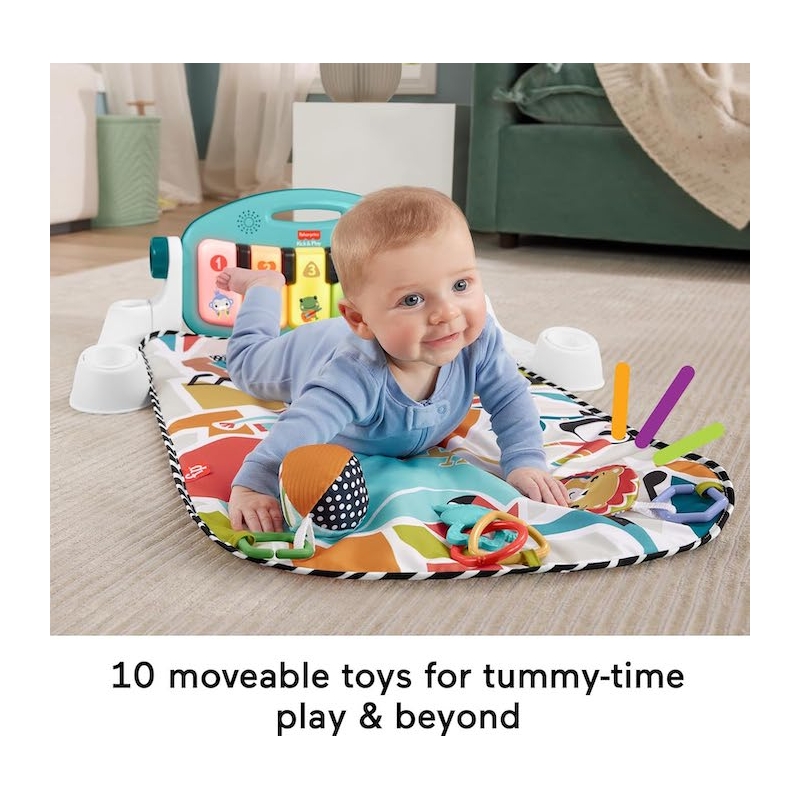 The Fisher-Price® Kick & Play™ Piano Gym is a musical activity gym with 4 ways to play as your baby grows from newborn to toddler! Moveable toys on the overhead arch encourage little ones to bat and grasp as they lay on the playmat and kick up some tunes on the piano. The arch adjusts for tummy-time play and the piano toy removes, so little musicians can sit up and play or take the show on the road.