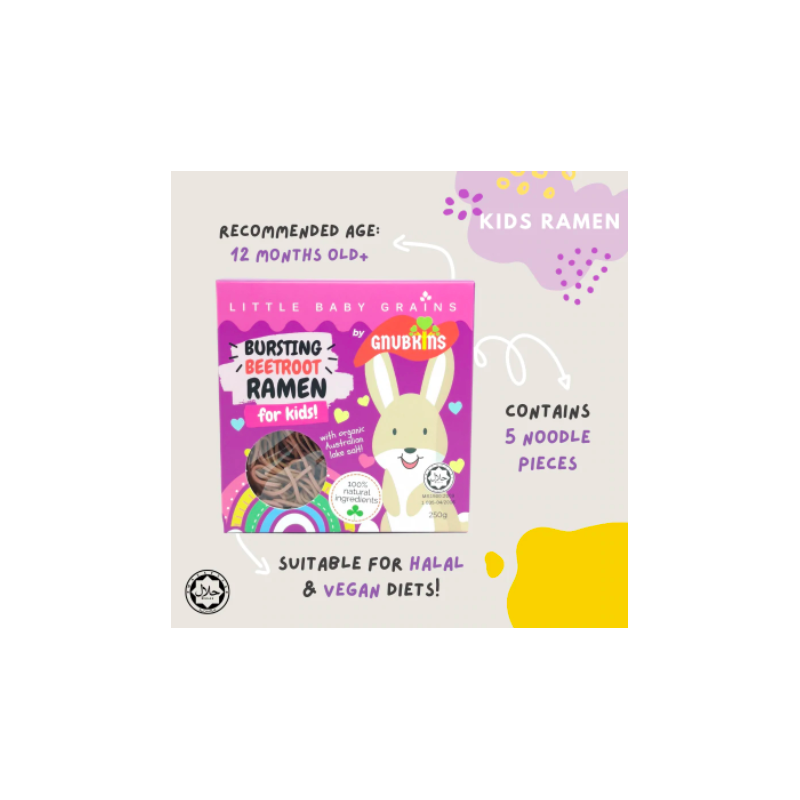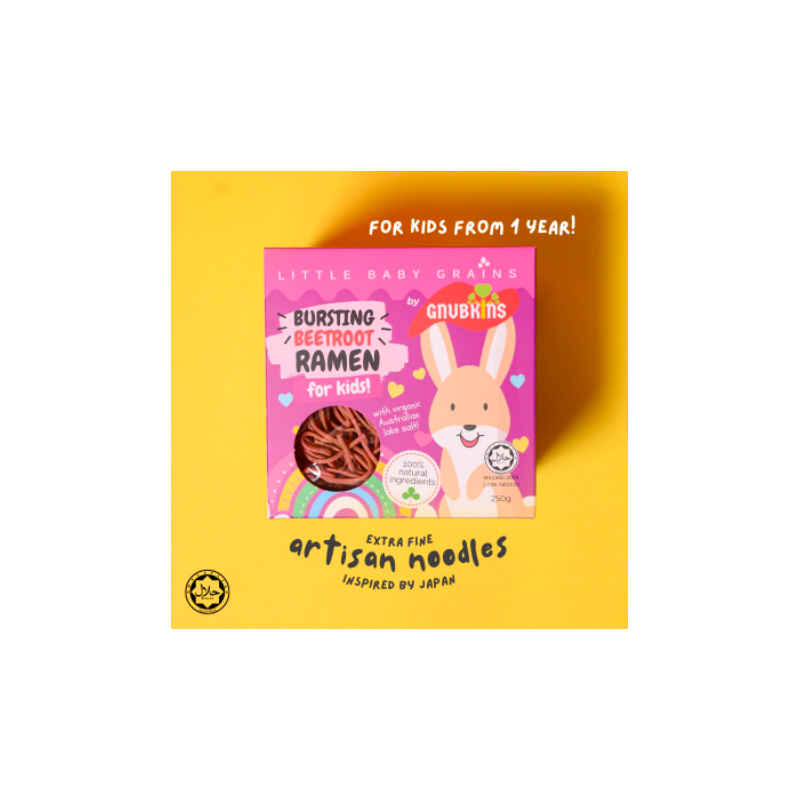 This ramen contains beetroot which is bursting with antioxidants, fibre and nutrients like calcium! Noodle length has been customised for kids so no cutting is required. Easy to cook, cooking on a stovetop takes about 4-5 minutes.