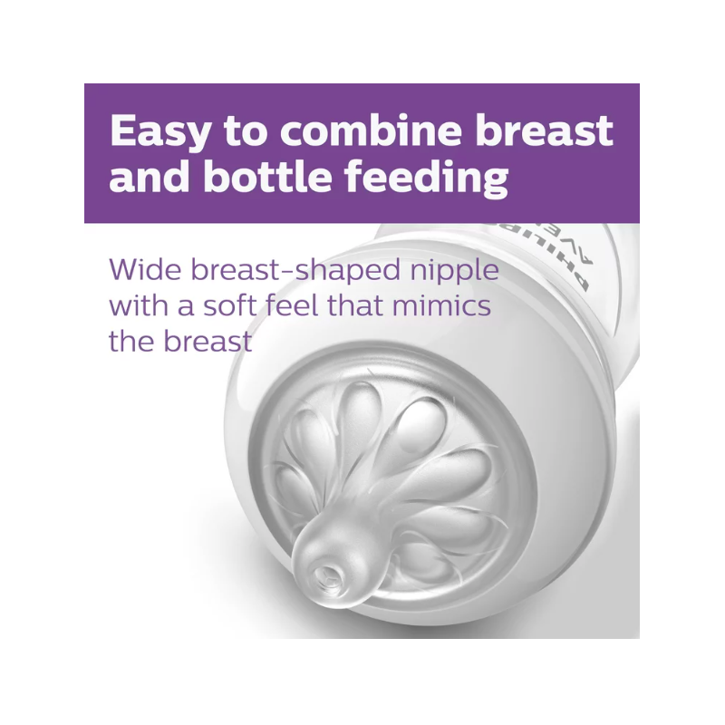 Our new bottle with the skin soft nipple material and flexible spiral design, more closely resembles the breast. The comfort petals and natural nipple shape allows natural latch on and makes it easy to combine breast and bottle feeding.