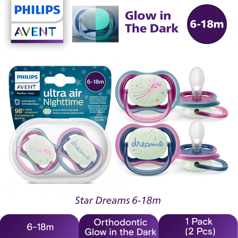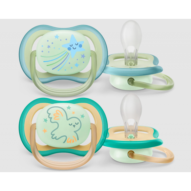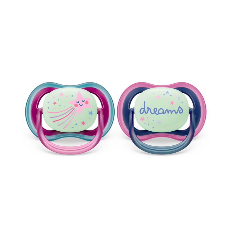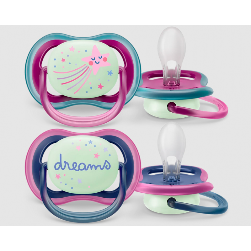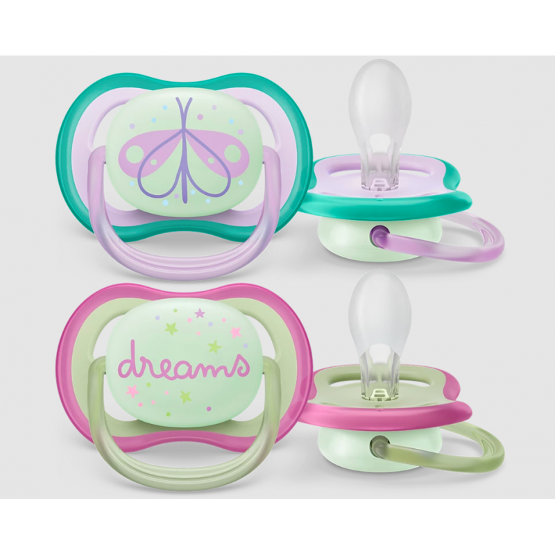 Soothe with the comfort of air. The Philips Avent ultra air has extra-large holes to keep skin dry. It has a glow-in-the-dark button so you can see it when the lights are out. Available in various colors and designs.